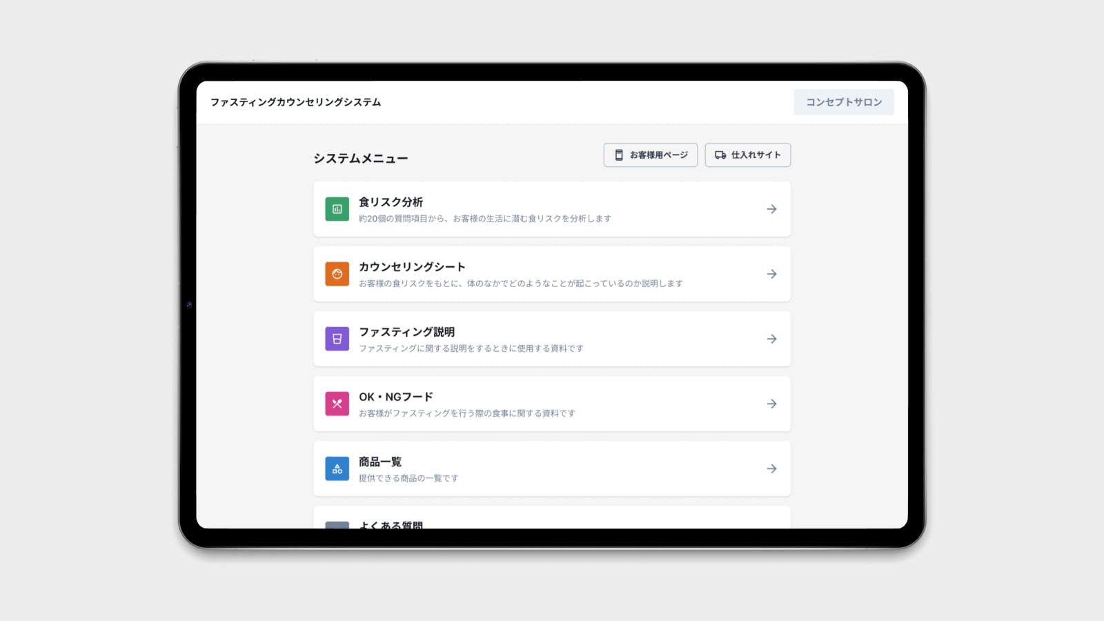 各店舗で行われていたインナービューティ商品のカウンセリング販売は、担当者ごとの属人性が高く、教育コスト増加が課題となっていました。 そこで、タブレットを用いて誰でも一定水準のカウンセリング提案が行えるシステムを開発。 店舗拡大に伴う教育負荷を軽減し、全店舗で均一な接客品質を実現しました。
